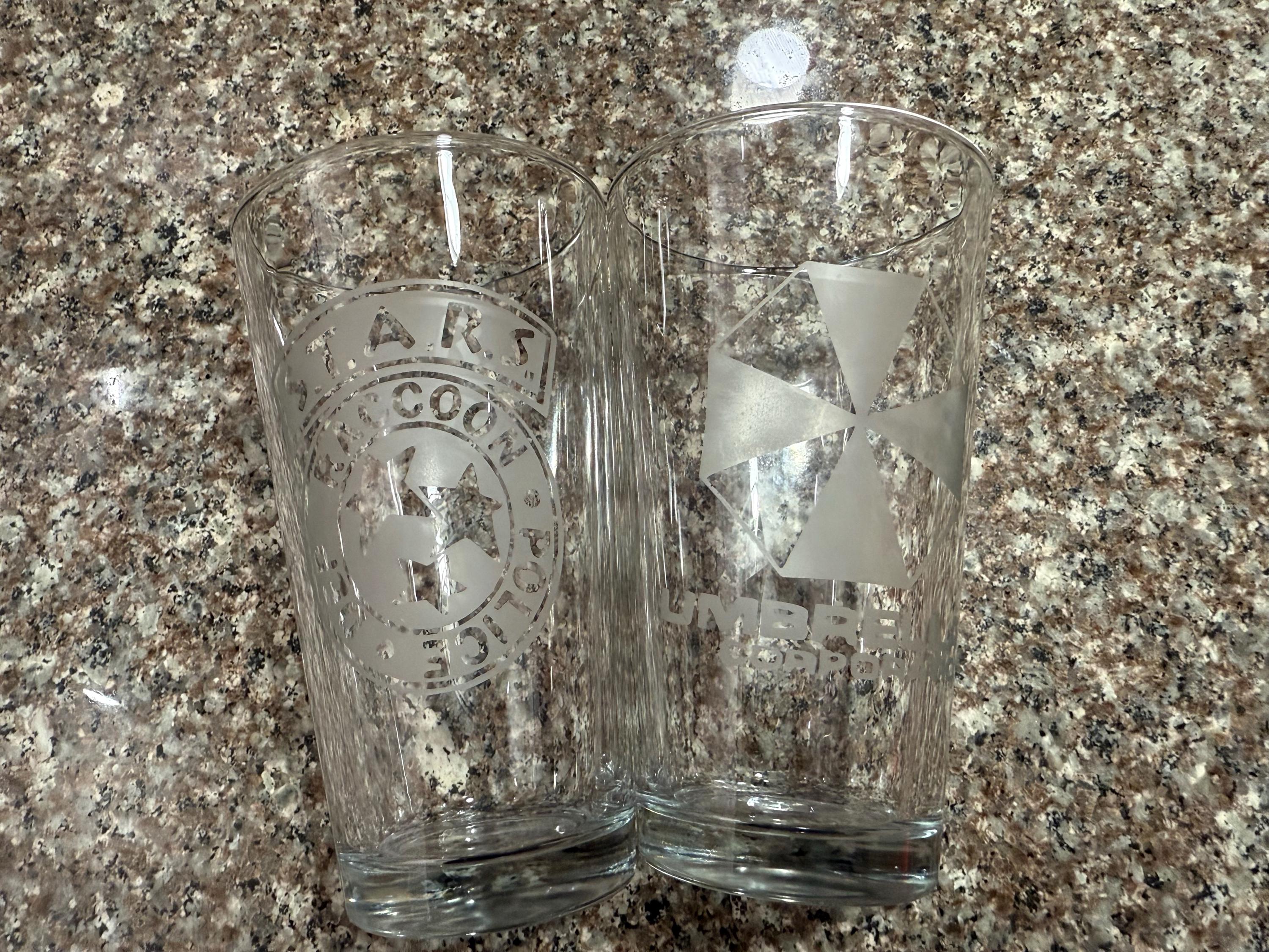 This listing is for two pub glasses with the raccoon city police logo etched into one and the umbrella logo into the other pub and shot glass. by fans of Resident evil.